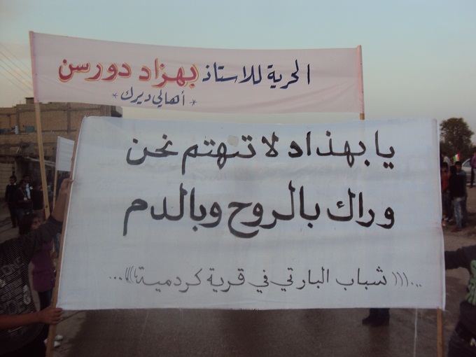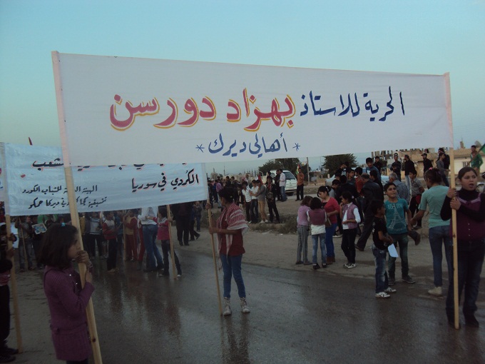 تواصلت الاحتجاجات أمس لليوم الثاني عشر على التوالي في مدينة ديرك , في إطار ما أطلق عليه (الحرية لبهزاد دورسن ), ففي ساحة جامع الشيخ معصوم احتشد عشرات الآلاف من المتظاهرين المنادين بالإفراج الفوري عن عضو المكتب السياسي للحزب الديمقراطي الكردي في سوريا (البارتي) , الأستاذ بهزاد دورسن ورفاقه , مؤكدين فيها بأن الدعوة إلى ذلك لن تتوقف.