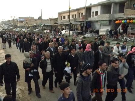 كما تم ترديد العديد من الشعارات المؤيدة لسري كانيه والمطالبة بخروج الجماعا ت المسلحة من البلدة وترك إدارة أمورها للأهالي وليس لأية مجموعة مسلحة أخرى وكذلك توحيد الجهود في سبيل إسقاط النظام وعدم الانجرار إلى اقتتال طائفي والتي لا تخدم مسيرة الثورة بل تخدم أجندات إقليمية وشخصية