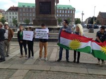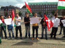 حاملين الأعلام الكوردية و مرددين شعارات تدعو للتنديد بجبهة النصرة و تنظيم الدولة الاسلامية في العراق و الشام، و جرائمهما بحق الشهب الكوردي في كوردستان سوريا (في سري كانيى و كرى سبي و كوباني) و مناطق التواجد الكوردي كتل حاصل و تل عران، و طالب المعتصمون الحكومة الدنماركية و المجتمع الدولي بالتدخل لايقاف هجكات العنصريين و التكفيريين الإرهابية على الشعب الكوردي و مناطقه، كما استنكر المعتصمون صمت المعارضة السورية و وقوف بعض اطرافها إلى جانب المعتدين، مسقطين نظام بشار و جبهة النصرة معا داعينا إلى حرية الشعب السوري و الشعب الكوردي و عدم اقرارها بالحقوق القومية المشروعة للشعب الكوردي وفق الاعراف و المواثيق الدولية. و دخل المعتصمون إلى ساحة البرلمان و طالبوا برلمان الدنمارك العضو في الاتحاد الأوربي بايصال صوتهم إلى الإتحاد و الأمم المتحدة و المنظمات الدولية المعنية. جدير بالذكر ان المناطق الكوردية شهدت في الفترة الأخيرةحربا شرسة و قتلا على الهوية و تشريدا و تهجيرا من مناطقه على يد الكتائب المسلحة التكفيرية و الشوفينية، في ظل صمت إقليمي و دولي مريب.